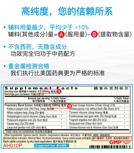 由100%纯天然中药制成。每味中药都经真品检定,质量上乘。传统水合煎翠取中药精华,专门工艺浓缩和压片。每一片都易于服用,易于吸收,功效显著而安全。广慈堂®所有片剂在我们先进的cGMP认证工厂生产,并根据美国FDA 指南进口。当您选择广慈堂®产品时,您选择的是科学与传统的完美融合,享受的是当今中医药领域的最高标准。